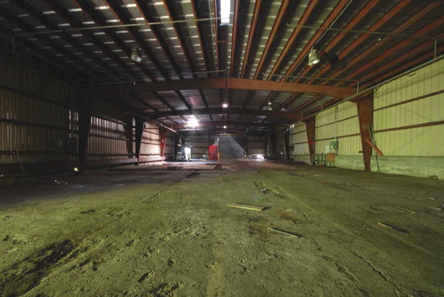 An empty and more modern warehouse built on the property.