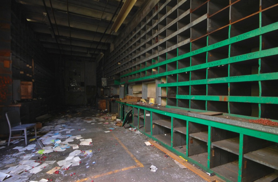 A long wall covered with green cubbyholes and shelves built for organizational purposes and to store small random miscellaneous parts such as Kindorf and beam clamps.