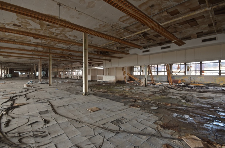 The top floor of the factory was utilized as office space. Again, not much remained. However, the floors were covered with tiles and the "golf tee" style concrete pillars were replaced with smaller iron beams.