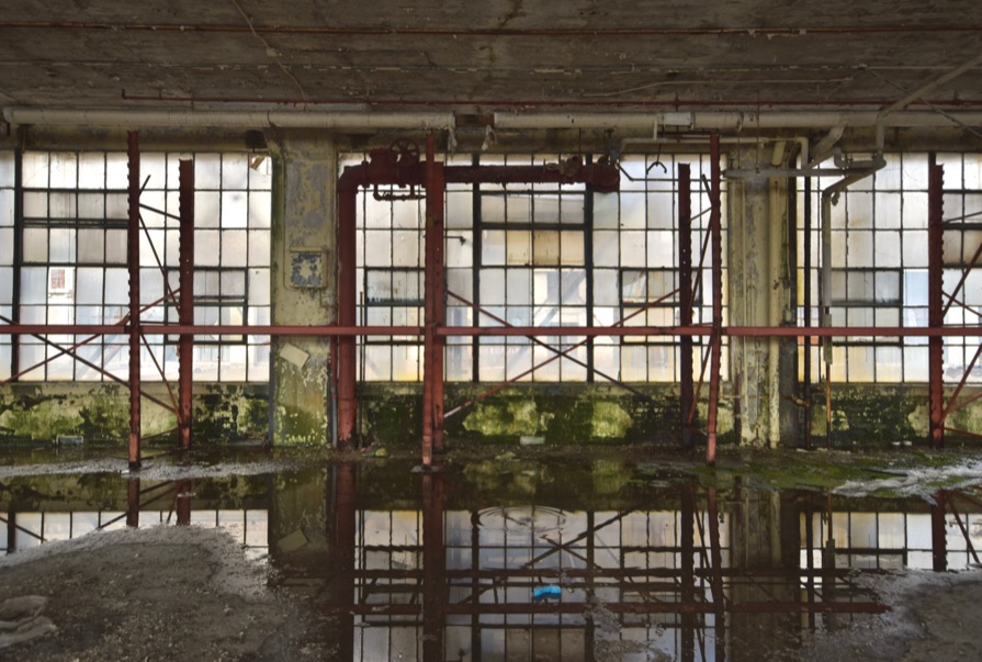 The red standpipe fire suppression system made for an interesting pop of color in the otherwise cavernous factory.