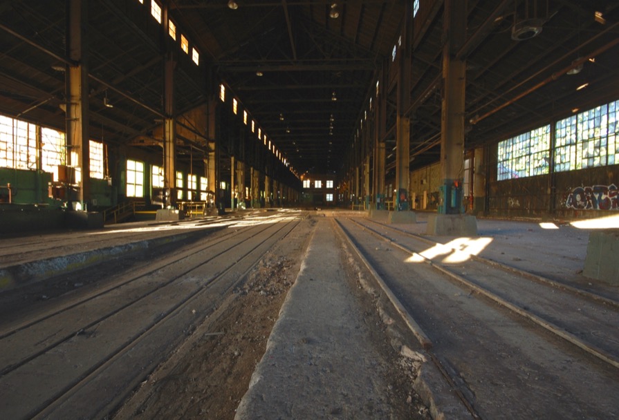 Oh joy, yet another empty industrial warehouse. However, this building did have a row of what appeared to be narrow gauge rail set into the concrete. This rail was mostly likely used internally as tracks for some type of crane or heavy duty machinery to move product back and forth.
