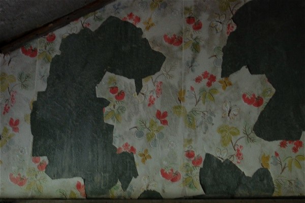 The tear in the wall paper looks like a muscular arm holding a knife!